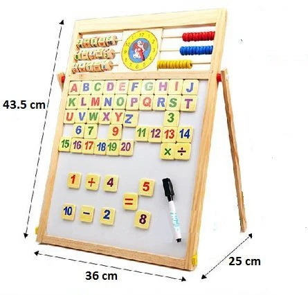 The easy-to-wipe black-and-white board with a smooth surface includes 26 magnetic wooden letters, numbers from 0 to 20 with math symbols, beads, and clocks.