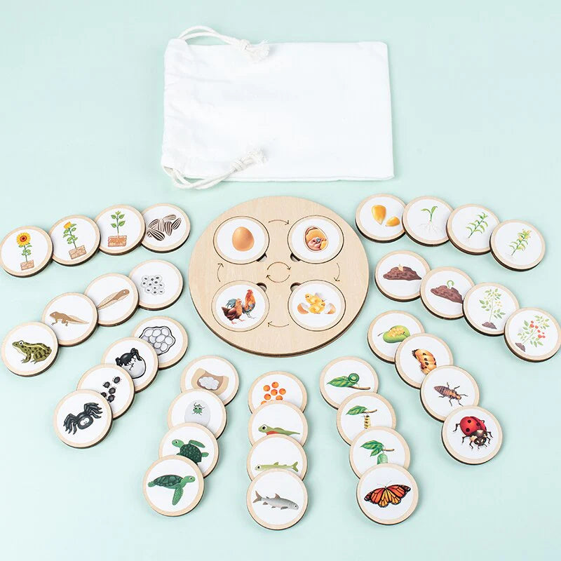 🌱 Variety of Life Cycles : Includes puzzles with five different life cycle themes, all designed to fit on the wooden board.